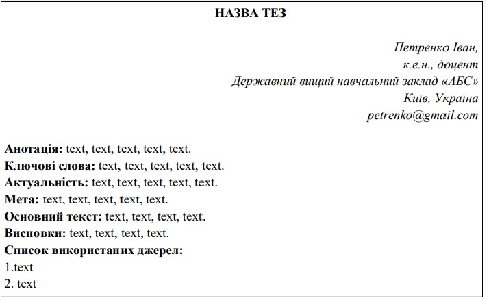 Обсяг тез: від 2 до 6 сторінок;